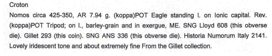 Vale un cenno l'ultimo di questi stateri , un esemplare della monetazione a peso ridotto ( 6.59 g. ) per il quale Rutter nel suo H.N.I. al n. 2178 , ricorda la ipotizzata attribuzione agli anni della venuta di Pirro in Magna Grecia .