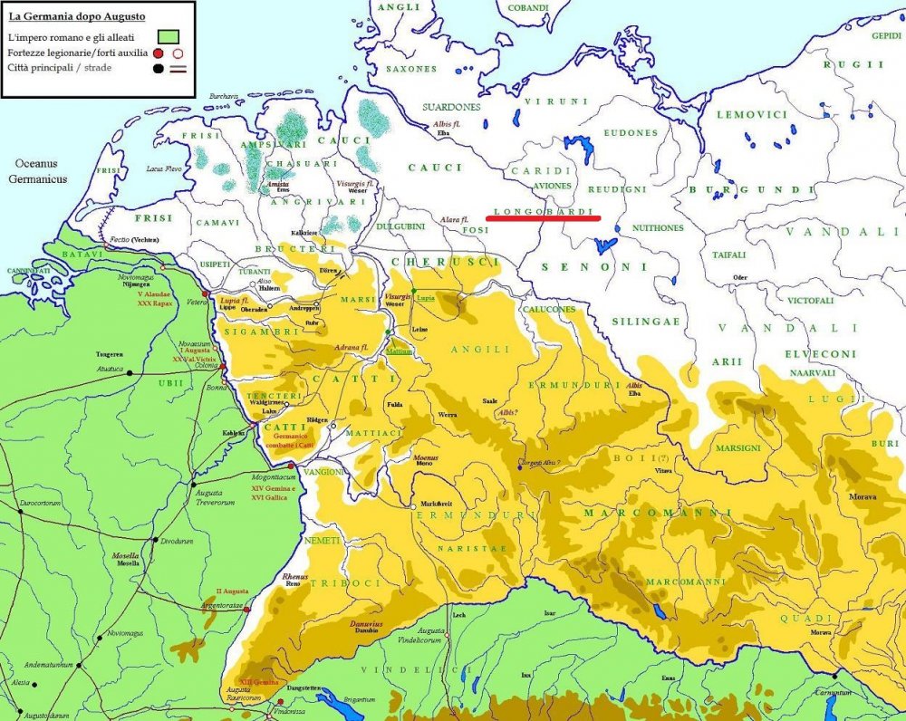 Lasciando in Germania i Longobardi , arriviamo ora al tempo di un’ altra grande migrazione storica di un popolo , quella degli Unni , che dalla probabile Siberia meridionale si diressero verso l’ Ovest europeo , questo spostamento degli Unni , dalle conseguenze devastanti , provoco’ un effetto domino nei confronti delle varie tribu’ germaniche ; i Longobardi lasciarono la Germania del Nord , dove erano rimasti per almeno cinque secoli e iniziarono la migrazione che li portera’ fino in Italia ; non e’ noto se raggiungere l’ Italia fosse una meta prestabilita , fatto sta che partendo dalla zona del basso Elba , attraversando la Boemia e la Moravia  , arrivarono in Pannonia , dove forse rimasero per un po’ tempo , quindi si spostarono nel Norico ormai quasi in vista dell’ Italia dove penetrarono attraverso la Valle dell’ Isonzo , che da sempre era stato il punto debole delle Alpi e quindi dell’ Italia dove in quel tempo dominavano i Bizantini .