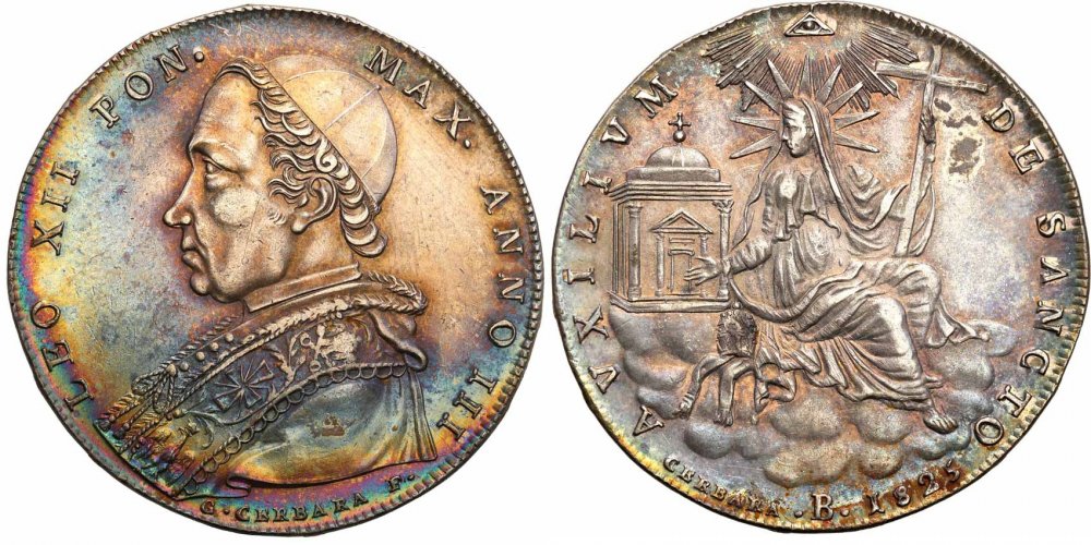 Sotto propongo tre patine diverse di uno Scudo Pontificio di Leone XII: la prima è quella che ritengo coeva (evidentemente però non piaceva perché troppo "pesante" e la moneta è andata invenduta - asta Nomisma); la seconda è una patina smaccatamente iridescente e certamente posticcia (asta dell'Est Europa); la terza è stata venduta ad un'asta NAC e mi lascia perplesso (patina aiutata?). Esistono poi patine diverse che si sono formate negli anni verosimilmente su monete inizialmente pulite ...