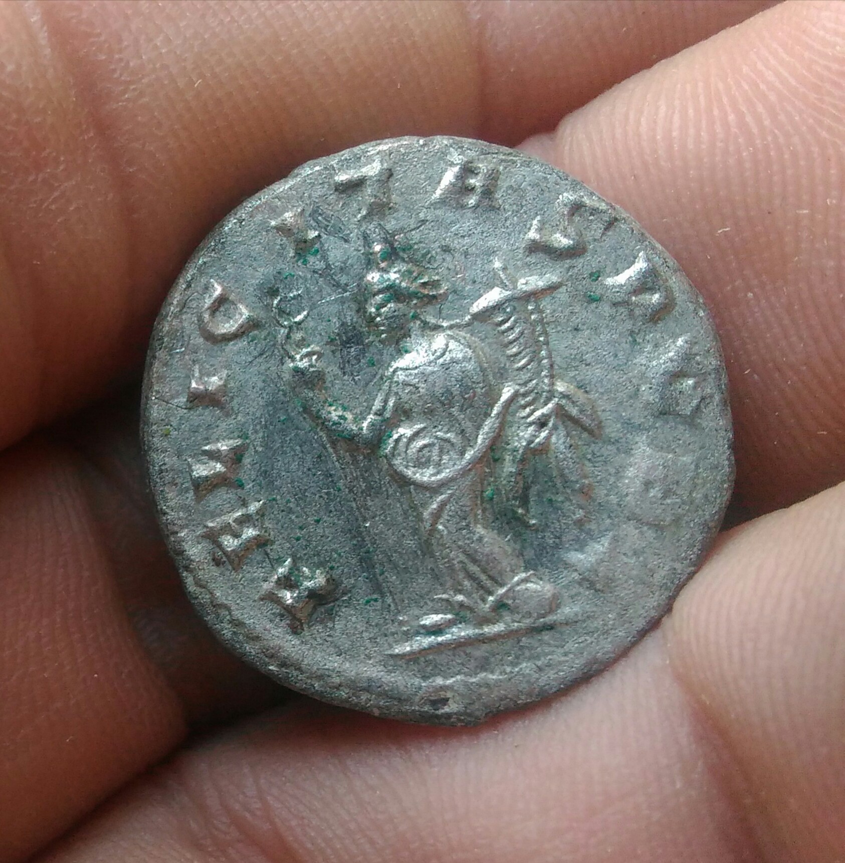 Avrei bisogno di un consiglio, secondo voi vale la pena provare a rimuovere questa macchia verde rame da questo Antoniniano raffigurante la Felicitas?