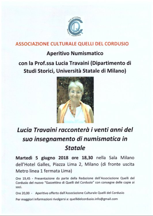 E' una serata che io consiglio fortemente anche ai giovani, a chi si sta appassionando,  venite e ascoltate una grande protagonista della numismatica, il suo vissuto numismatico e di vita, anche eventuali consigli, il suo vedere la moneta oltre al solo valore economico ma anche negli aspetti simbolici, ritengo sia una occasione questa unica, irripetibile, una storia di 20 anni tra monete, libri, studenti, sicuramente aneddoti  interessanti e poi Milano ...la Milano numismatica ...