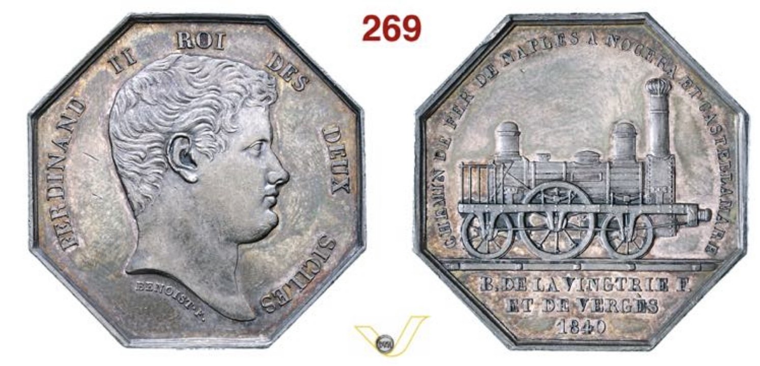 “…Armando Joseph Bayard de la Vingtrie, un ingegnere francese, nel mese di gennaio del 1836 espose un suo progetto ferroviario al marchese Nicola Santangelo, ministro di Ferdinando II di Borbone. Per costruire la linea ferrata a proprie spese, in cambio della concessione della gestione per 99 anni. La strada ferrata avrebbe collegato Napoli con Nocera, con una diramazione per Castellammare. Il Re approvò la concessione con decreto del 19 giugno 1836, dietro versamento di una cauzione di 100.000 ducati. Seguirono altri due decreti, uno del 3 febbraio 1838, che rimodulava la durata della concessione ad 80 anni ed un altro definitivo del 19 aprile 1838 che sanciva il diritto di proprietà dello Stato dopo 80 anni di gestione. I lavori, diretti dall’ingegnere francese, incominciarono l’8 agosto 1838. Dopo tredici mesi il primo tratto giungeva al Granatello di Portici. I vagoni furono costruiti a Napoli, nello stabilimento di San Giovanni a Teduccio, le locomotive acquistate dalla società inglese Longridge Starbuck e Co. Il primo tratto della Ferrovia fu inaugurato il 3 ottobre del 1839 con grande solennità. Il re a Portici diede il segnale di partenza davanti a tutte le autorità, pronunziando un discorso in cui disse: "Questo cammino ferrato gioverà senza dubbio al commercio e considerando come tale nuova strada debba riuscire di utilità al mio popolo, assai più godo nel mio pensiero che, terminati i lavori fino a Nocera e Castellammare, io possa vederli tosto proseguiti per Avellino fino al lido del Mare Adriatico". In questo primo tronco, di ponti ne furono costruiti ben 33, con 2.958 metri di mura di sostegno e metri 541 di ringhiere di ferro. Nel 1840 la via ferrata arrivò a Torre del Greco, nel 1842 a Castellammare di Stabia. I lavori furono continuati per portare la Ferrovia fino a Nocera e terminarono il 18 maggio del 1844. La medaglia fu coniata solo in Francia, come si evidenzia: dal disegno ottagonale di chiara fattura francese, dalle scritte, l’incisore; tipici della zecca di Parigi. Le medaglie francesi, dal 1832, furono marcate sul taglio con identificazione del periodo di coniazione e del metallo utilizzato. La medaglia fu coniata, con i conii originali, dal 1840 per tutto il XIX secolo. (lampada 1832-1841: prora 1841-1842: ancora 1842-1845: mano 1845-1860: ape 1860-1879: corno dell’abbondanza 1880…).