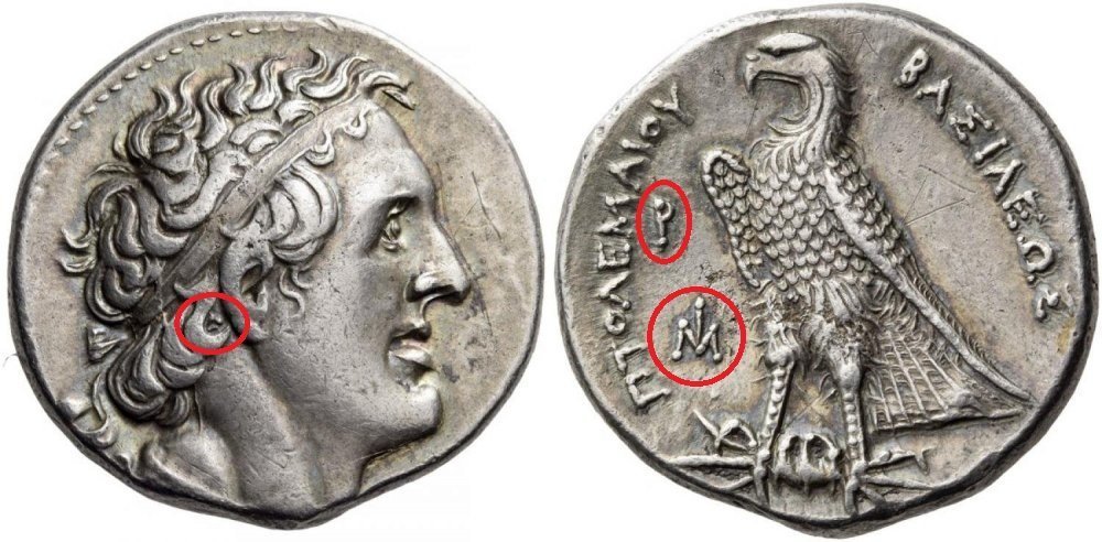 Solo il :Greek_Delta: dietro l'orecchio di Tolomeo rimane costante perchè indica il taglio finale dell'emissione: il fatto che non sia l'iniziale di un incisore o di un addetto della zecca è dimostrato dal fatto che ricorre su troppi conii e anche a distanza di tempo.