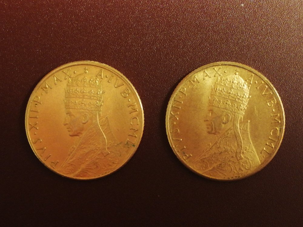 Mi è capitata una moneta un pò strana e cioè un 20 lire città del Vaticano 1950 Pio XII in ORO,non sono riuscito a trovarla da nessuna parte,sembra ne sia stata fatta una sola!! ho provato a pesarla e ad analizzarne il materiale e mi risulta oro 900 il peso è gr.6,45 e il diam 21,85 la firma del creatore è Giampaoli ed è perfettamente incisa senza sbavature e leggerezza di conio per cui deduco che la moneta sia autentica ma introvabile su tutti i cataloghi,è uguale al 100 lire ma questa ha il valore di 20 lire.