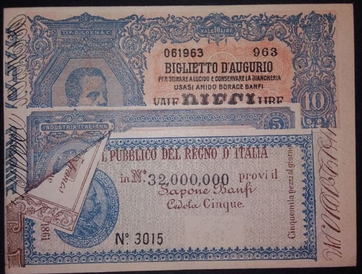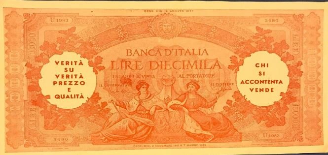 Biglietti pubblicitari che riproducono banconote italiane sino agli anni '80.