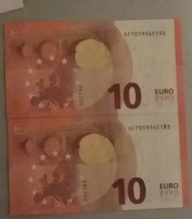 2 banconote da dieci euro con il solito numero seriale meno che le ultime due cifre