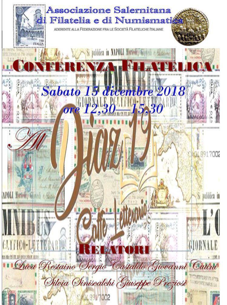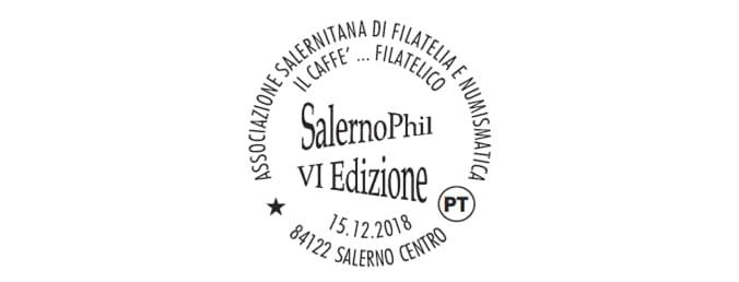 Il 15 dicembre 2018 si terrà a Salerno presso il Caffè letterario DIAZ 19 in via A.Diaz 19, dalle ore 12:30 alle 15:30, la VI edizione di SALERNOPHIL, conferenza filatelica organizzata dall'Associazione Salernitana di Filatelia e Numismatica, che prosegue nel percorso divulgativo, iniziato nel 2013, della cultura e dello studio della filatelia.