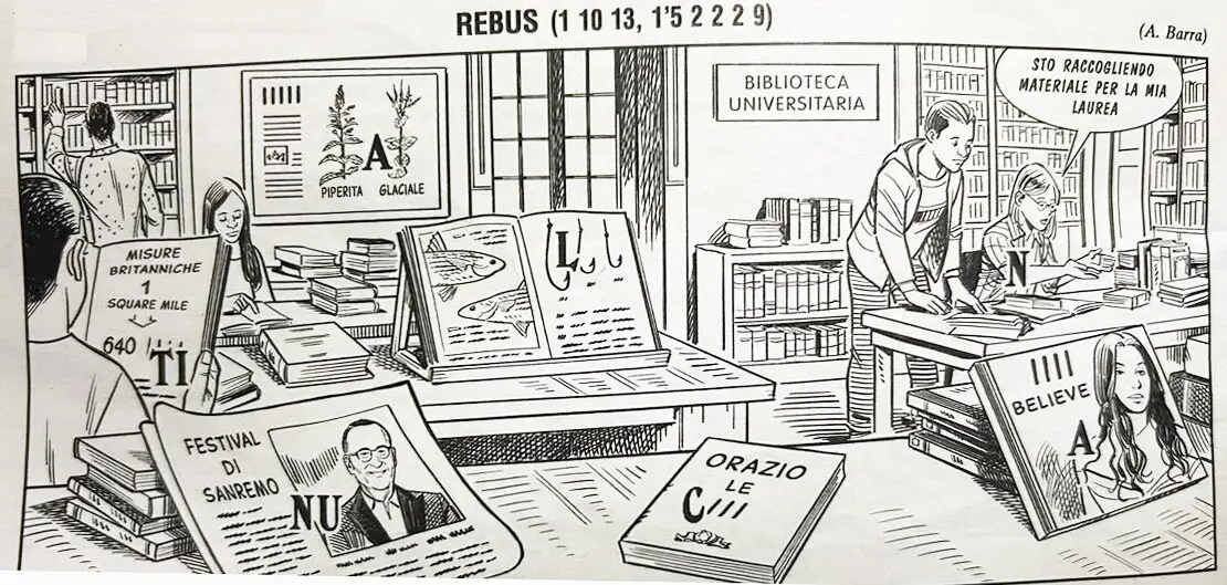 È il primo rebus a cambio che debuttò sulle pagine della Settimana Enigmistica nel 1953. Le lettere MG di chi illustrò il rebus sono le iniziali di Maria Ghezzi, La Brighella, consorte dell’inventore anche di questa varietà di rebus, il grande Briga (Giancarlo Brighenti).