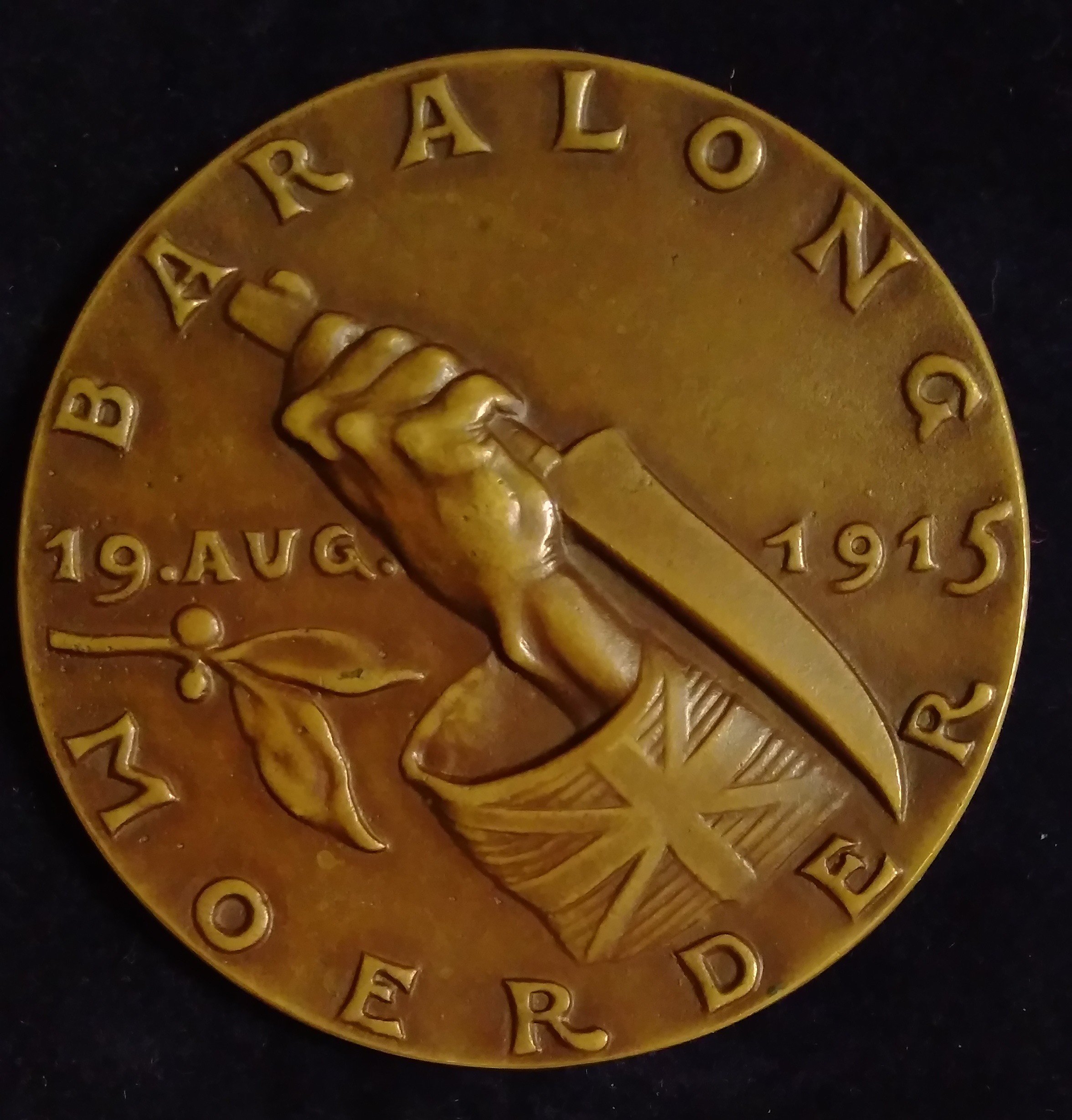 Hand holding a knife, sleeve displaying the British Union Jack; to left and right: 19. AUG 1915; laurel branch; around: BARALONG/ MOERDER (“Baralong murder”)