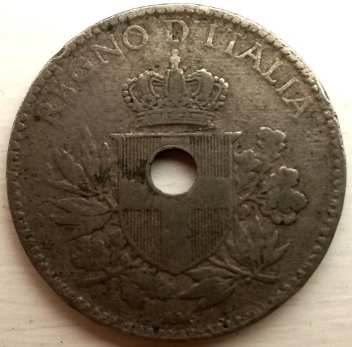 Non so se il foro su questo 20 centesimi del 1919 (tra l'altro una tipologia con una storia già di suo piuttosto "travagliata", anche senza essere bucata) sia coevo: nel caso fosse stato realizzato per poi reimpiegare il tondello come un ciondolo, sembra più adatto per il rovescio che, come più logico sarebbe stato, per il diritto, dove appare invece un poco decentrato rispetto allo scudo sabaudo.
