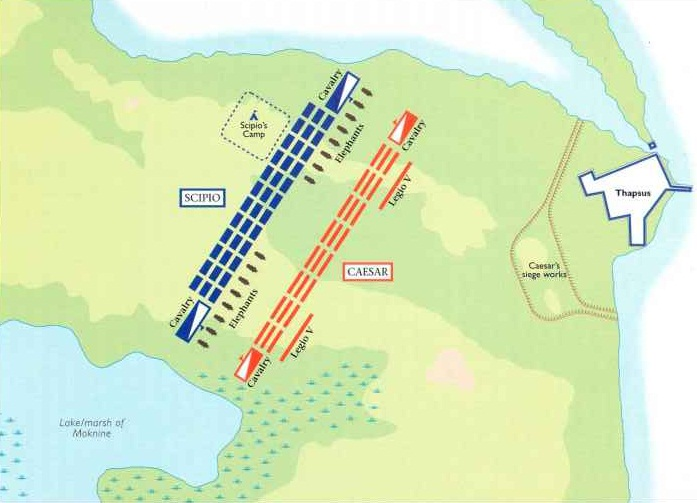 Il primo pericolo immediato per i legionari cesariani era costituito dagli elefanti, che furono prontamente respinti grazie all'intervento della Quinta, la quale riuscì, tramite vari stratagemmi, come quello di lanciare sassi e fare un forte rumore, a spaventare i pachidermi e quindi a far in modo che essi fuggissero. Nella loro fuga travolsero le file dei repubblicani, i quali, assieme ai numidi, finirono in rotta. Cesare aveva vinto anche questa volta, ma la battaglia non era finita.