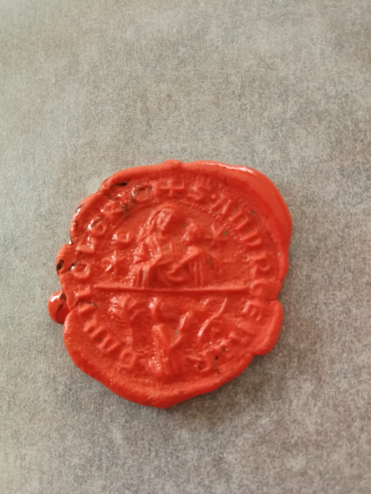 Ho provato a farlo su plastilina ma si attacca al sigillo e non si legge quasi nulla... Ora vi mando una foto senza alcuna modifica dove un mio amico ha provato ad identificare alcune lettere. Per le immagini invece confermo quanto avete detto sopra, vergine con bambino e sotto una figura intenta a pregare. Mi sto scervellando per cercare di identificare periodo ed utilizzo.