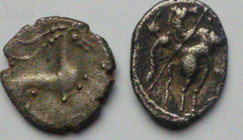 Quella a sinistra mi sembrerebbe proveniente da Ainos (Grecia) o una sua imitazione celtica/tracia, ci guarderò più tardi.