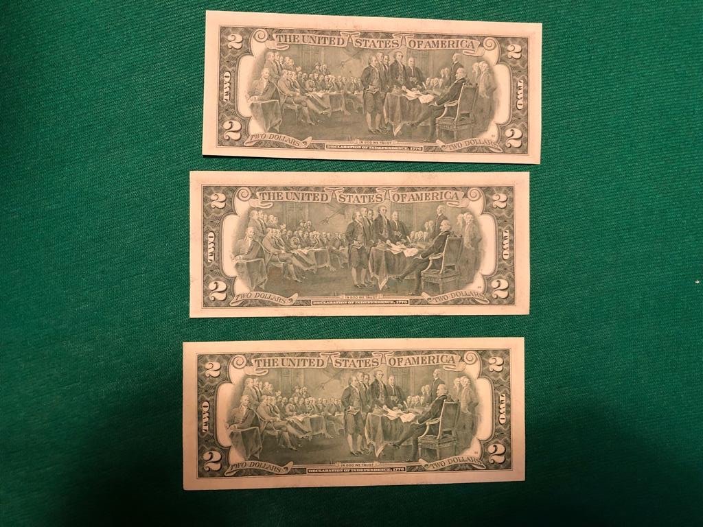 Ciao, questa banconota è stata appositamente prodotta per il bicentenario della Dichiarazione d’Indipendenza degli Stati Uniti, quelle che mostri, trattandosi della serie del 1976, fanno parte della prima emissione, hanno solo questo di speciale.