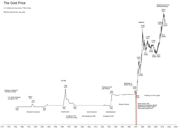 Il prezzo dell'oro è rimasto notevolmente stabile per lunghi periodi di tempo. Ad esempio, Isaac Newton, come maestro del Regno Unito Menta, ha fissato il prezzo dell'oro a L3.17s. 10d. per oncia troy nel 1717, e rimase effettivamente la stessa per due secoli, fino al 1914. L'unica eccezione è stato durante le guerre napoleoniche dal 1797 al 1821. Il prezzo ufficiale del governo USA oro ha cambiato solo quattro volte dal 1792 ad oggi. A partire da $ 19,75 per oncia troy, elevato a 20,67 $ nel 1834, e $ 35 in 1934. Nel 1972, il prezzo è stato portato a $ 38 e poi a $ 42,22 nel 1973. Un sistema di prezzi a due livelli è stato creato nel 1968, e il prezzo di mercato per l'oro è stato libero di fluttuare da allora.