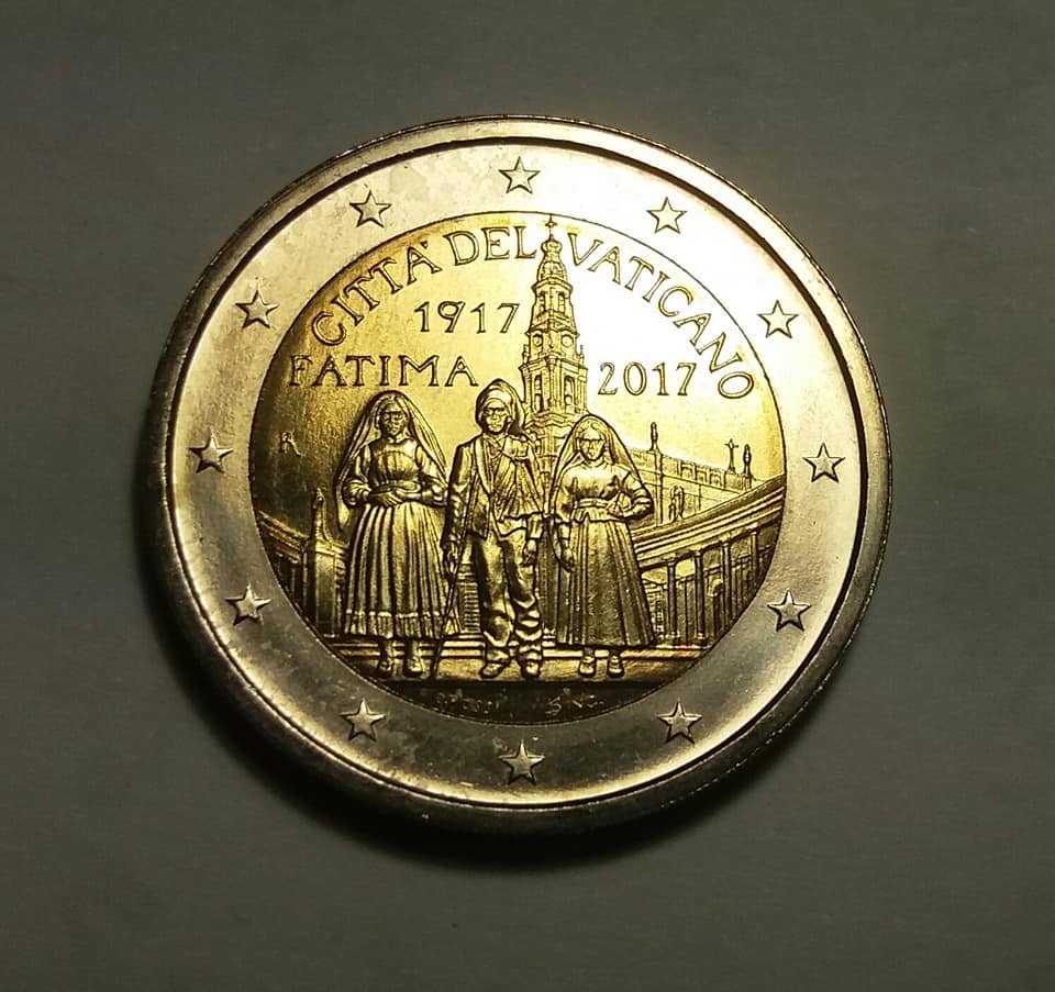 La moneta commemora il 100° anniversario dell'apparizione della Madonna a Fatima, ai tre pastorelli: Lucia dos Santos e ai suoi cugini Francesco e Giacinta Marto.