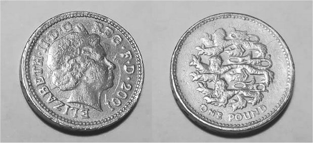 Mi è capitata per le mani questa Sterlina, datata 2001, che ha sia il diametro (22,5 mm) che il peso (9,5 gr.) della coniazione, il colore e la sensazione al tatto sono del tutto simili alle altre monete dello stesso taglio, il bordo è liscio con la scritta "DECUS ET TUTAMEN", infine lo spessore è il canonico 3,15 mm.