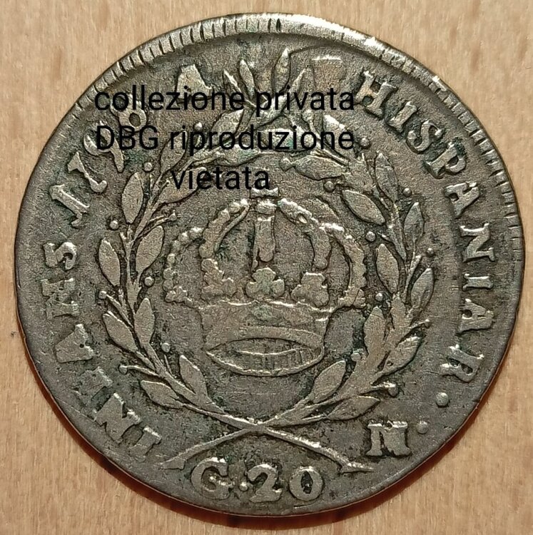 R/HISPANIAR  INFANS data; nel campo corona reale tra due rami di alloro, in alto le lettere A e P, divise dalla punta dei rami, inferiore te al lato destro la lettera M, sotto, tra gli steli dei rami stessi, lungo il bordo, il valore G 20.