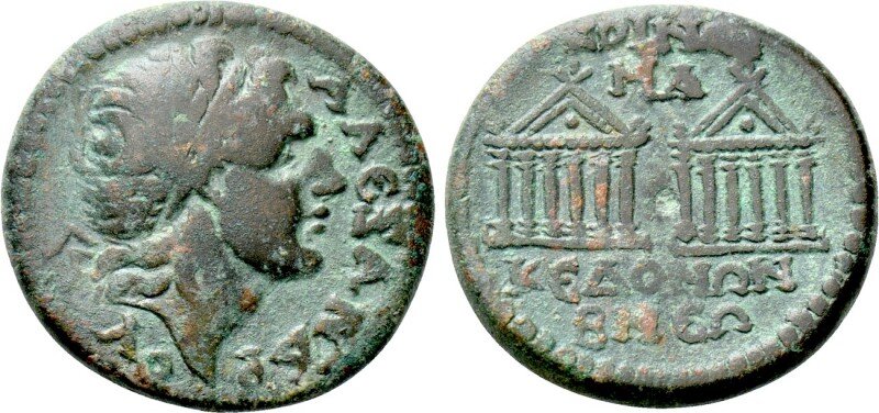 Tornando un po' indietro, a Sardi non ci si accontentava di un tempio, ma se ne rappresentavano addirittura due. Su questo grande bronzo di Settimio Severo, due templi pentastili sono raffigurati l'uno di fronte all'altro. Direi che alcune grandi e antiche città dell'Asia (Nicea, Efeso, Sardi, Tarso...) hanno coniato le più spettacolari monete con monumenti.