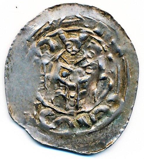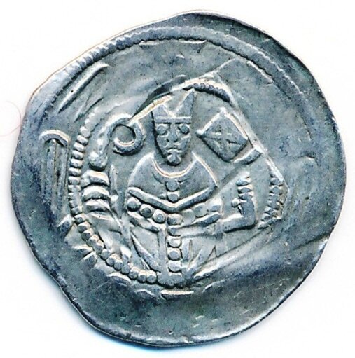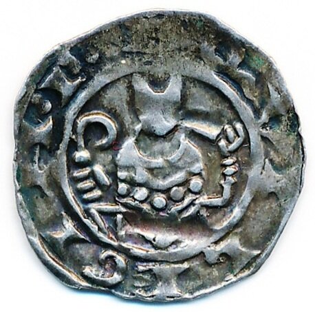 Questo è il nuovo denaro di Pellegrino II, coniato dopo l'Editto imperiale del 1195 che proibiva ai Patriarchi di Aquileia di imitare le monete dei Vescovi di Salisburgo. Molto particolare è la figura del Patriarca. Resa con pochi tratti stilizzati con il busto a triangolo rovesciato da cuo sporgono le braccia e le gambe, anch'esse rese con pochi tratti geometrici. Il tempio sul rovescio ricorda molto quello delle monete di Friesach, ma di stile più accurato. Il peso di queste emissioni è di circa 1,20 grammi e il diametro di 22 millimetri. Caratteristica tipica di questi denari è la forte scodellatura e il bordo molto largo.