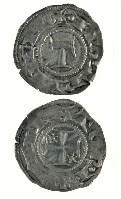 Questo è l'altro denaro coniato da Gregorio con Electus. Il primo era stato postato da @ottone poco più in alto. Sul dritto vi è la stessa figura che non rappresenta un Patriarca, ma un prelato con un libro tenuto davanti a sè. Sul rovescio un giglio ornamentale.