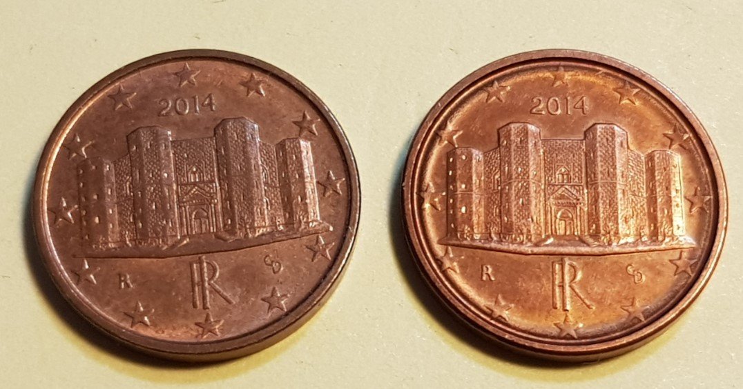 Questo 1 eurocent 2014 (a dx nella foto) presenta una cerchiatura interna lungo il bordo ben definita, che mi pare gli altri esemplari non abbiano.