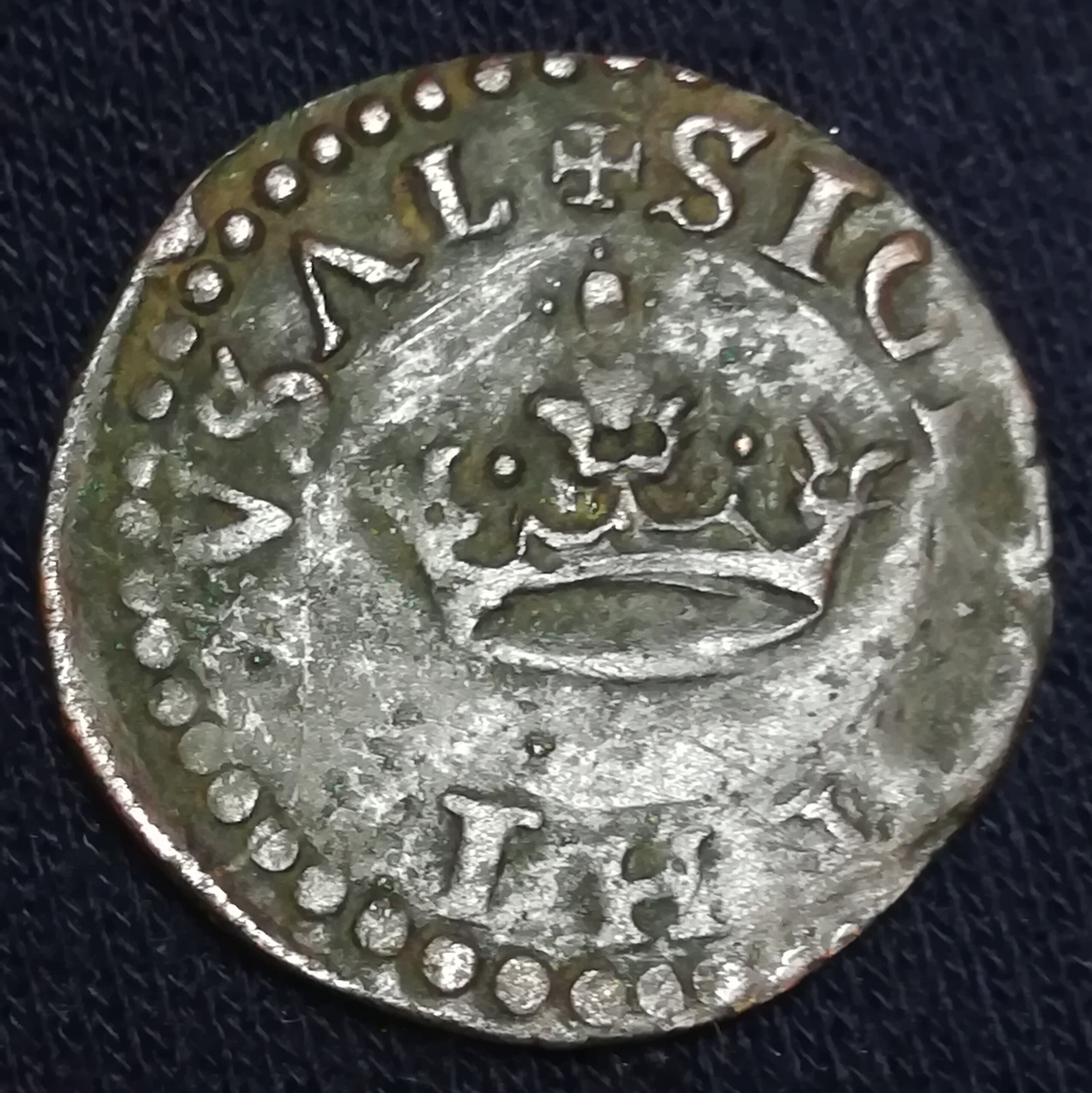Al centro Corona Reale sormontata da un punto e tre piccoli puntini posizionati sopra e ai lati del punto stesso. Intorno  SICIL ET HIERVS^L divisi in alto da Croce potenziata, il tutto entro cerchio perlinato.