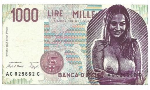 Goditi piuttosto la celestiale visione di quella gnocc... signorina desnuda che campeggia su una banconota che INCRDIBILE MA VERO! è saltata fuori dalla circolazione ed è ancora attualmente valida!, pronta ad alleggerire le nostre pesanti giornate a soli 35 € (veri)!