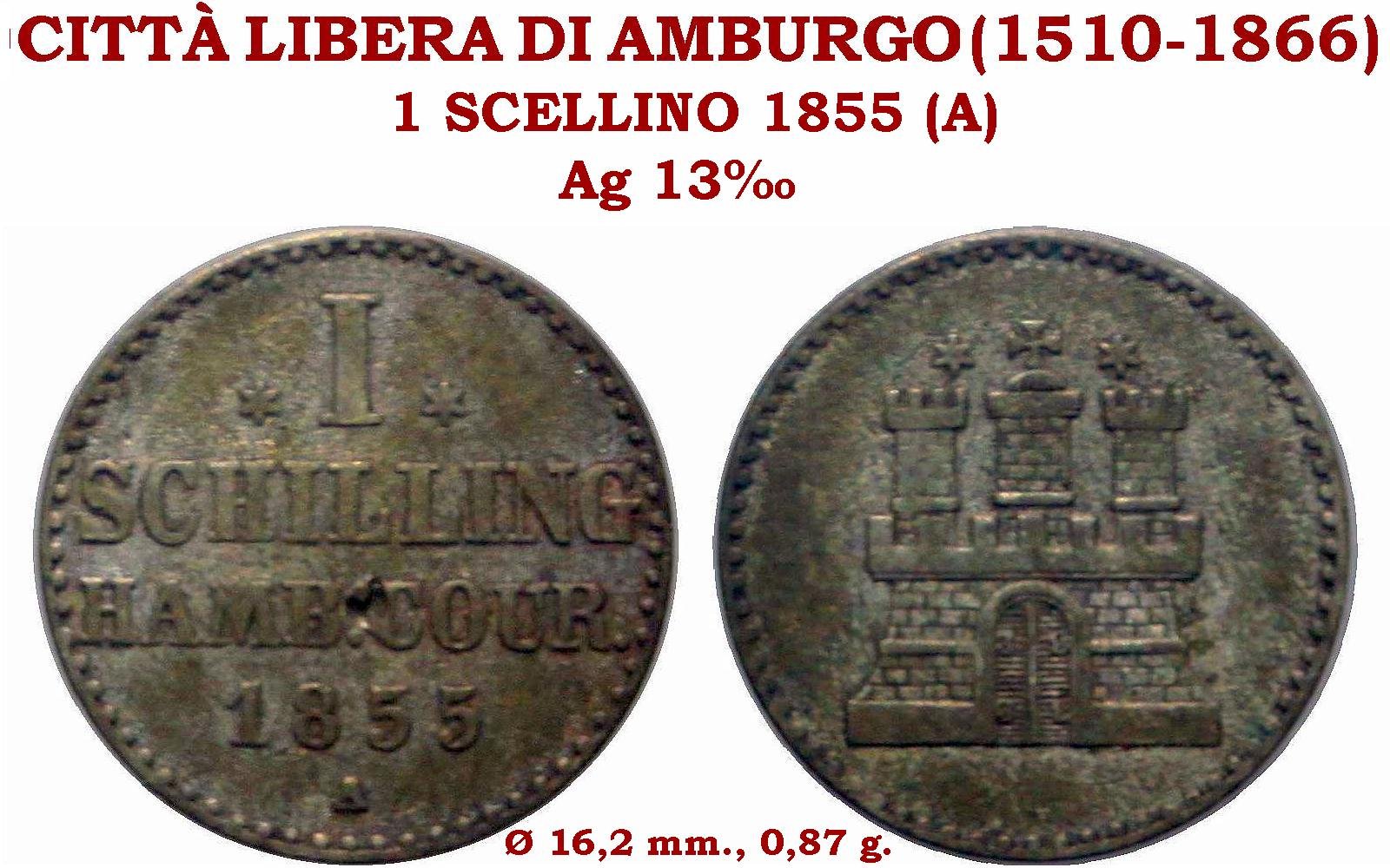 Oggi voglio mostrarVi una piccola moneta a basso tenore di Ag (trovata nell'album "dei rottami"...). Si tratta di uno Scellino della Città Libera di Amburgo (1510-1866) che conservò questo nome pur passando dei periodi come città facente parte di regni ed imperi. Solo con l'occupazione napoleonica (1810-1814) entrò a far parte (non più "libera", ma per poco) dell'Impero Francese, mentre perse definitivamente questa caratteristica nel 1866 quando divenne, ufficialmente, una metropoli del II Reich sotto Guglielmo I. Di questo Scellino 1855 ne esistono due varianti: la prima, coniata in 112.000 esemplari riporta una "A" sotto la data (come questo esemplare), mentre un secondo conio ne è privo e fu battuto in 1.841.000 pezzi.