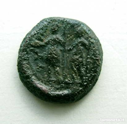 R/ Dioscuri stanti leggermente a sinistra, con astro sulla testa, poggiano la mano sinistra a lunga asta e tengono una coppa nella mano destra; a sinistra, TY NΔA e a destra PITAN; bordo lineare.