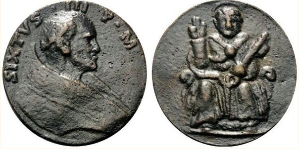 La medaglia scelta è una emissione di restituzione fusa verso la fine del XVI secolo e rappresenta al Dritto il papa a capo nudo e con piviale e al verso la figura di San Pietro con nimbo, benedicente, seduto di fronte con piviale, regge le Chiavi del regno dei cieli.