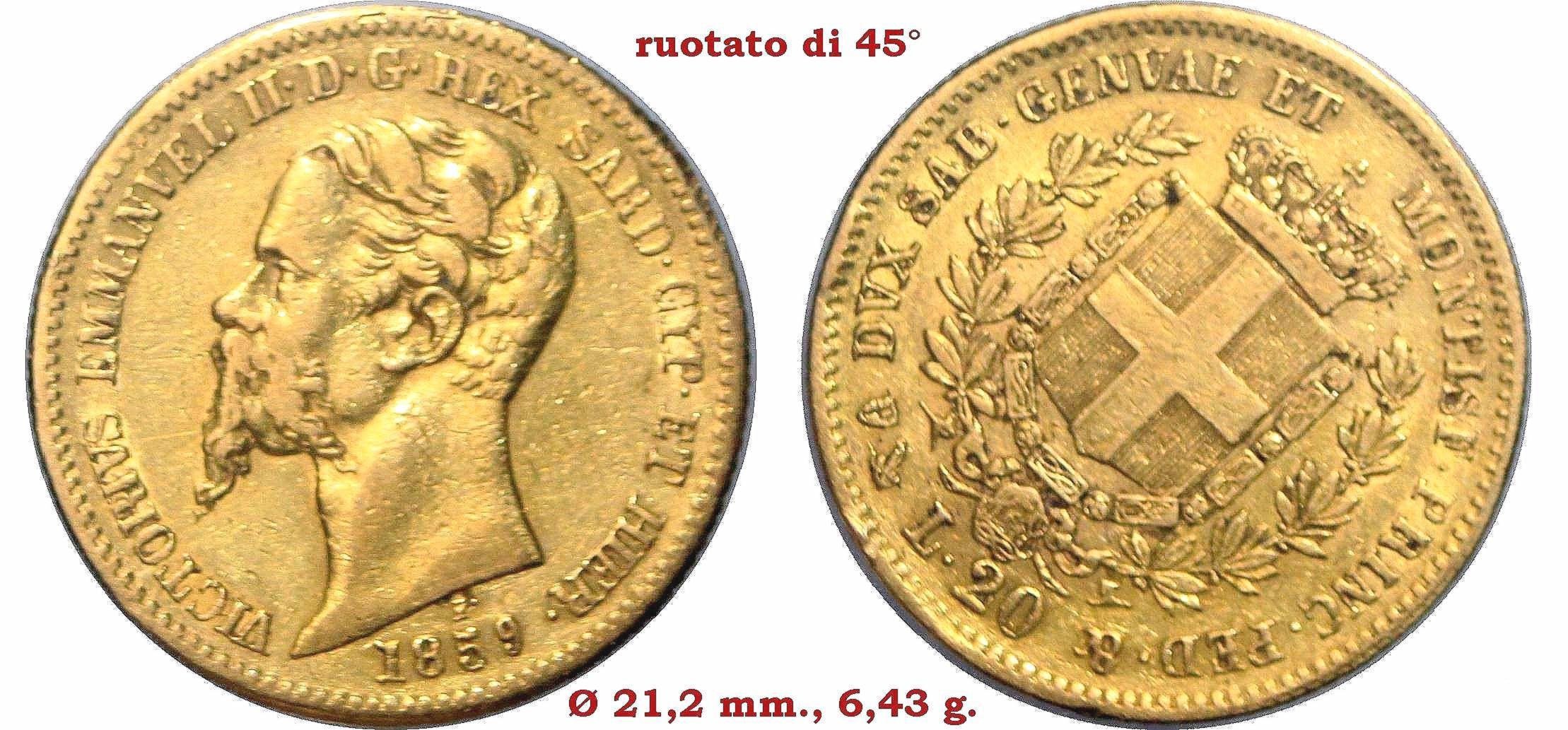 Grazie a coloro che sono intervenuti. Il primo Marengo da me postato (1859 GE), non è riportato da alcun catalogo (Attardi e Montenegro). L'Attardi, per il 1859 riporta solo uno con rotazione di 25° e lo valuta R2: pertanto, penso di poter classificare anche il mio con tale rarità. Il secondo (1856 GE) compare nel catalogo Montenegro (2015) e classificato R3. Sono errori di conio che, per ora, ho trovato solo su V.E.II re di Sardegna. Rinnovo l'invito a mostrare i vostri "con rotazione" qualora li aveste. Grazie.