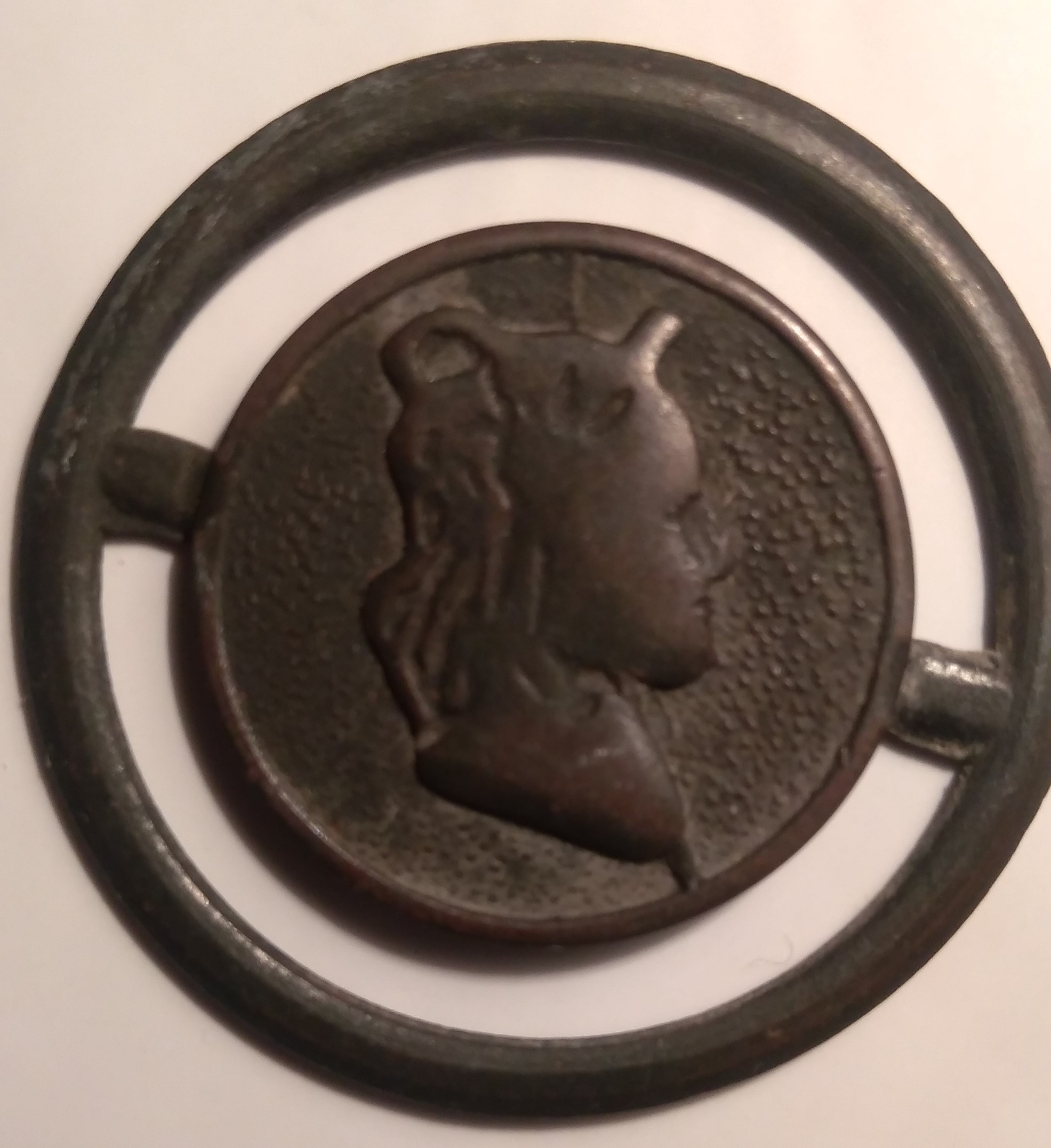 Sopra la testa della donna si vede chiaramente un anello, almeno così a me pare, come se all'origine fosse una medaglietta, inoltre a destra in basso, dove il collo termina, si vede in rilievo come un'asta che collega il volto al bordo del disco, un piccolo elemento che dovrebbe avere un qualche significato.....
