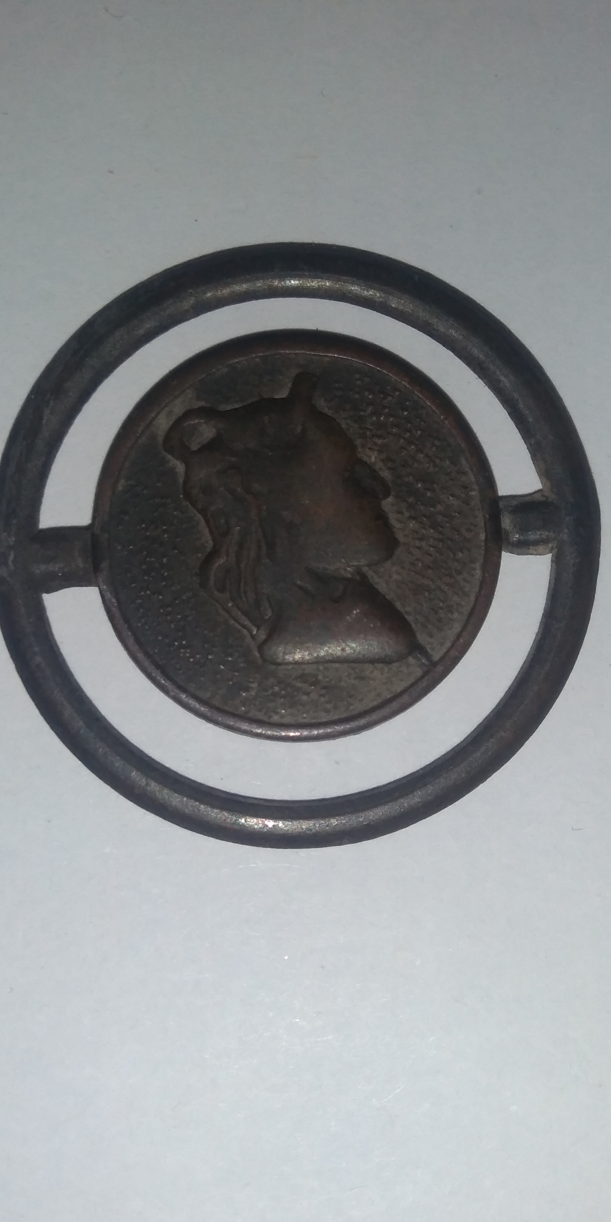 scusate il delay solo ora sono riuscito a rimettere mano alla nostra discussione. Ho fatto qualche foto in più sperando in una risoluzione accettabile. Il Verso ha l'incuso della figura femminile di cui non vi ho parlato nella precedente discussione in quanto speravo in un riconoscimento diretto dell'effige. Io ipotizzo sulla fronte un possibile diadema, o sbaglio secondo voi. Potrebbe trattarsi di un oggetto d'artigianato ottocentesco? Che so una promessa ad una donna, un regalo alla mamma.