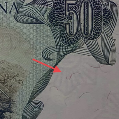 I "pelucchi" mostrati in foto sono fibre colorate appositamente inserite nella pasta della carta in fase di produzione: lungi dall'indicare che la banconota è falsa, al contrario sono un'indicazione di autenticità perché di solito alcune di esse sono luminescenti se esposte ai raggu UV e quindi fungono da dispositivo anticontraffazione.