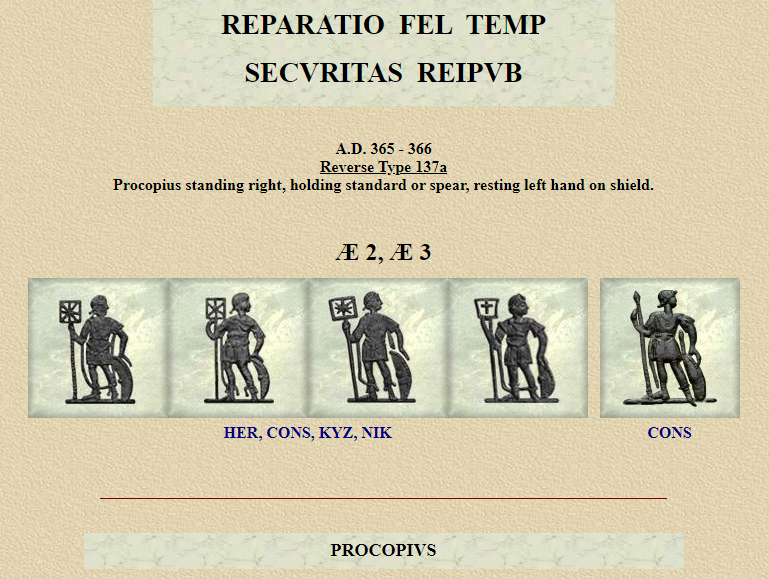 Essendosi impadronito della maggior parte delle zecche orientali (Costantinopoli, Cizico, Nicomedia ed Heraclea) Procopio mandò addirittura suoi uomini di fiducia nell’Illirico (non casualmente, essendo zona di confine tra pars orientis e pars occidentis) a distribuire monete con la sua effigie,  come ci riferisce Ammiano. Si tratta di  monete con al rovescio proprio REPARATIO FEL TEMP…