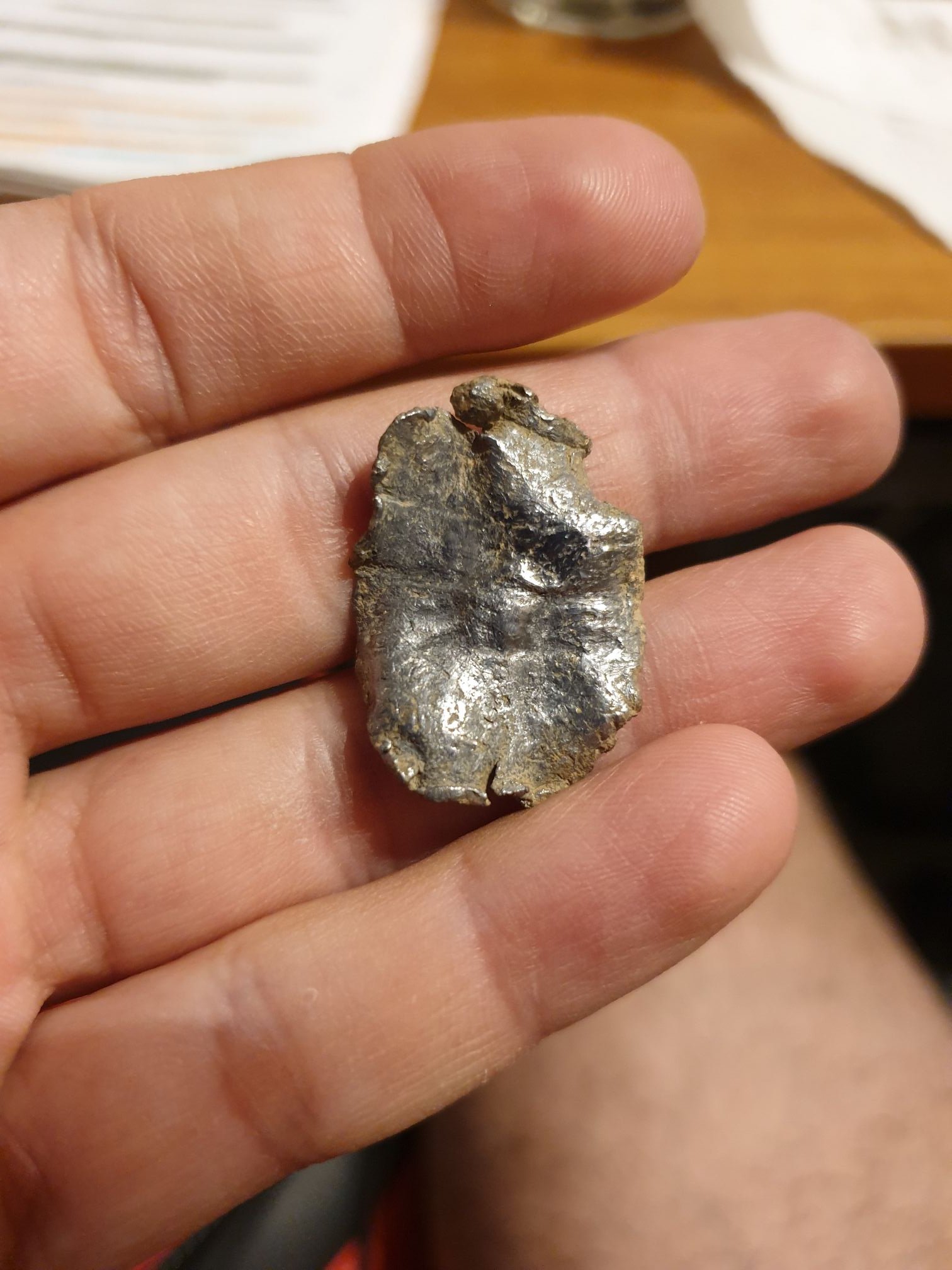 Sinceramente a me pare una pallottola impattata. Riesci a comprendere che metallo sia? Se piombo potrebbe essere ciò che resta di una pallottola anche se oggi vengono utilizzati anche altri materiali.