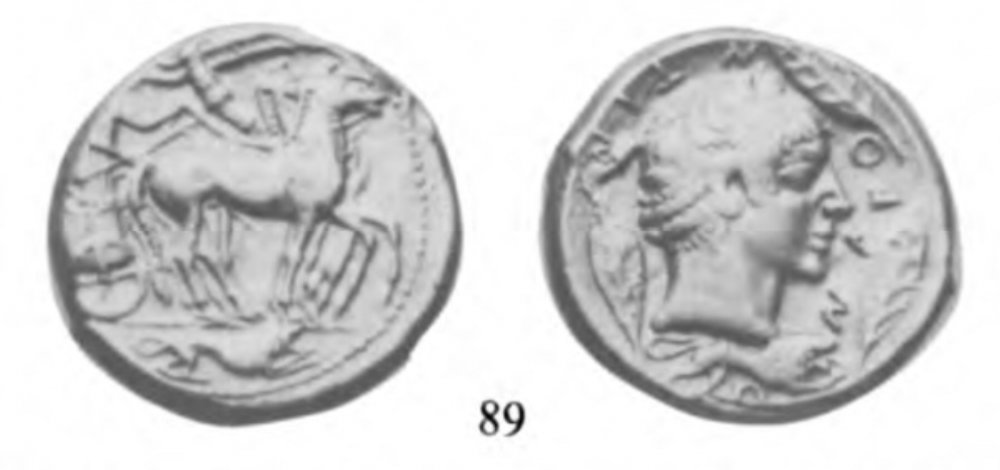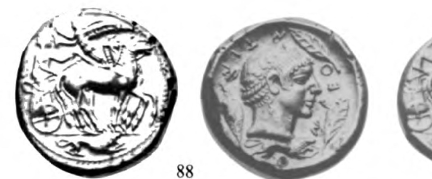 Per la stessa ragione, gli esemplari 88 e 89 del ripostiglio di Randazzo « ricostituito » e studiato nel 1990 da Carmen Arnold-Biucchi mi sembrano provenire dallo stesso conio di rovescio, con questa rottura sotto il secondo N dell’etnica.
