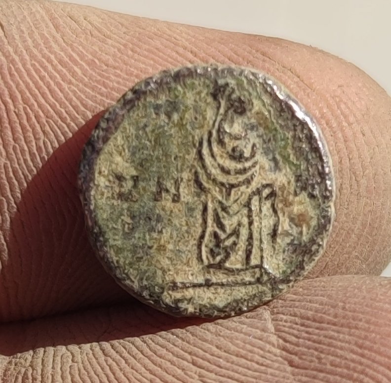 Dovrebbe essere una moneta post-mortem di Costantino, con la scritta (abbreviata) che significa "venerandae memoriae, e la figura velata dell'imperatore in piedi. Sull'altro lato, la testa velata dello stesso. La zecca non si legge.