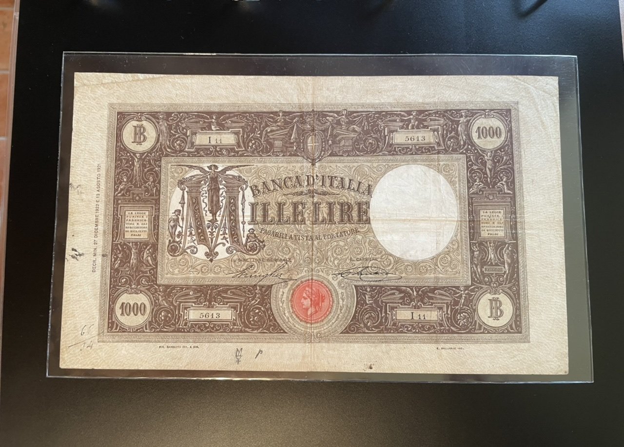 Riguardo il mille lire del 1920 presentato: se tutti i pezzi spiegazzati che compongono i quattro bordi esterni sono presenti tanto da formare il biglietto intero, a mio parere siamo sul quasiMB, direi un migliaio di euro, non oltre.