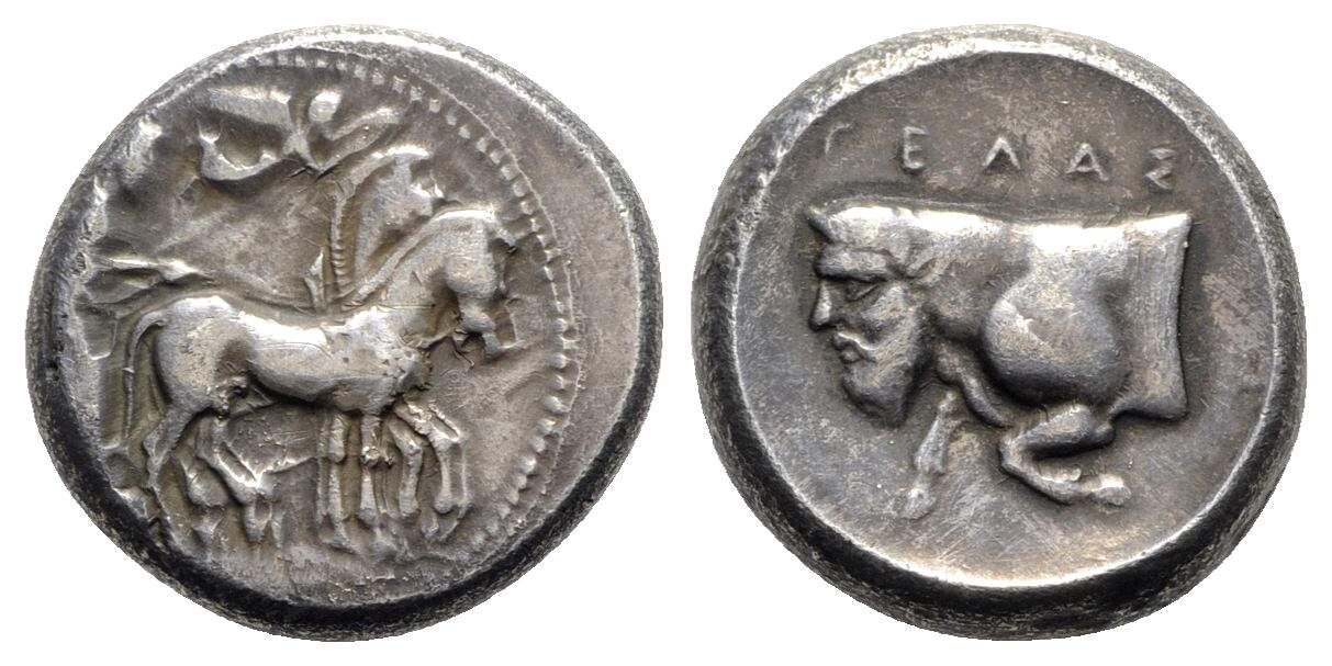 The reason will be clear to the most experts already from the title (and no, it is not wrong, alas), as the straight coinage O46 belongs to group II of The coinage of Gela by Jenkins, dated between 480 and 470 BC, while the reverse O182 belongs to group VIII dated to 420-415 BC (a date also indicated by Bertolami for the specimen in question).