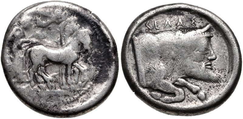 The late archaic style of the obverse is opposed by the now fully classical one of the reverse. Not only that, the O46 coinage should have remained available to the Geloa mint for sixty years (and 47 pages of the catalog of Jenkins' corpus I add) surviving unscathed the fall of the tyranny, the struggles between the Sicilians of Ducezio and the Siceliots, at the first war with Athens, to reach the gates of the second great Athenian expedition in Sicily, from Gelone and Ierone directly to Hermocrates in short.