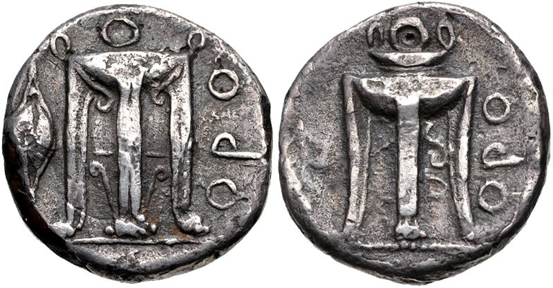 BRUTTIUM, Kroton. Circa 430-420 BC. AR Stater (19mm, 6.67 g, 12h). Tripod; barley grain to left / Tripod; ivy leaf to left. Possibly unpublished with grain/leaf symbols, but cf. HN Italy 2113-9 for similar. VF, toned, some porosity. From the Volteia Collection.