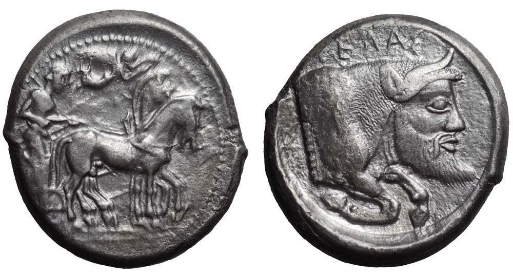 Troppe parole, meglio lasciare spazio alle immagini, ponendo l’attenzione sulla frattura di conio che condividono i primi quattro esemplari postati (tra le gambe posteriori ed anteriori dei cavalli) nonché sulle differenze di stile ed epigrafiche (la lettera gamma) al rovescio.
