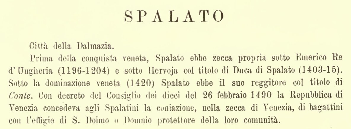 E' una bellissima serie quella di cui fa parte questa emissione. Antivari con S. Giorgio, Lesina con S. Stefano, Sebenico con S. Michele, Trau con S. Lorenzo, Zara con S. Simeone e appunto Spalato con S. Doimo. A questi aggiungerei Treviso con S. Liberale e, cambiando tipologia da bagattino a quattrino, Ravenna con S. Apollinare e Rovigo con S. Bellino. Solo la zecca di Roma può stare alla pari con una squadra di Santi così numerosa...