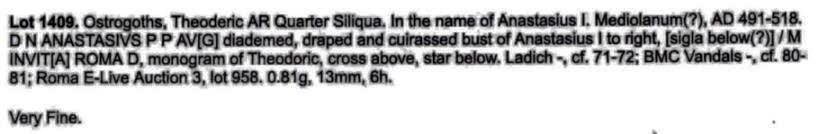 Un piacevole 1/4 di siliqua di Teodorico ( al nome di Anastasio I ) , è passato oggi in asta RomaNum. 90 al lotto 1409 .