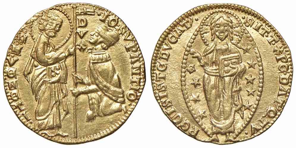 (Per dovere, riporto anche che al D i due ducati hanno lo stesso caratteristico punto sotto il gomito del santo ma vessillo diverso e da notare il punto a sx dell'aureola del santo sul ducato di F. Dandolo, e che al R il ducato di F. Dandolo ha un puntino tra i piedi del Cristo)