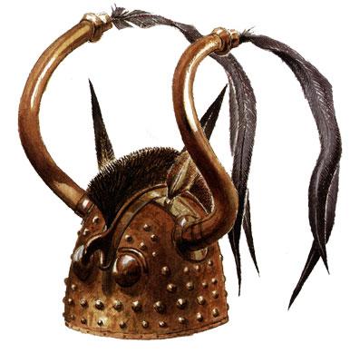Il celebre "vaso dei guerrieri" scoperto a Micene da Schliemann ( ora al museo archeologico di Atene ) è un cratere cretese-miceneo attribuito al 1150 a.C. : i guerrieri rappresentati indossano elmi con corna .