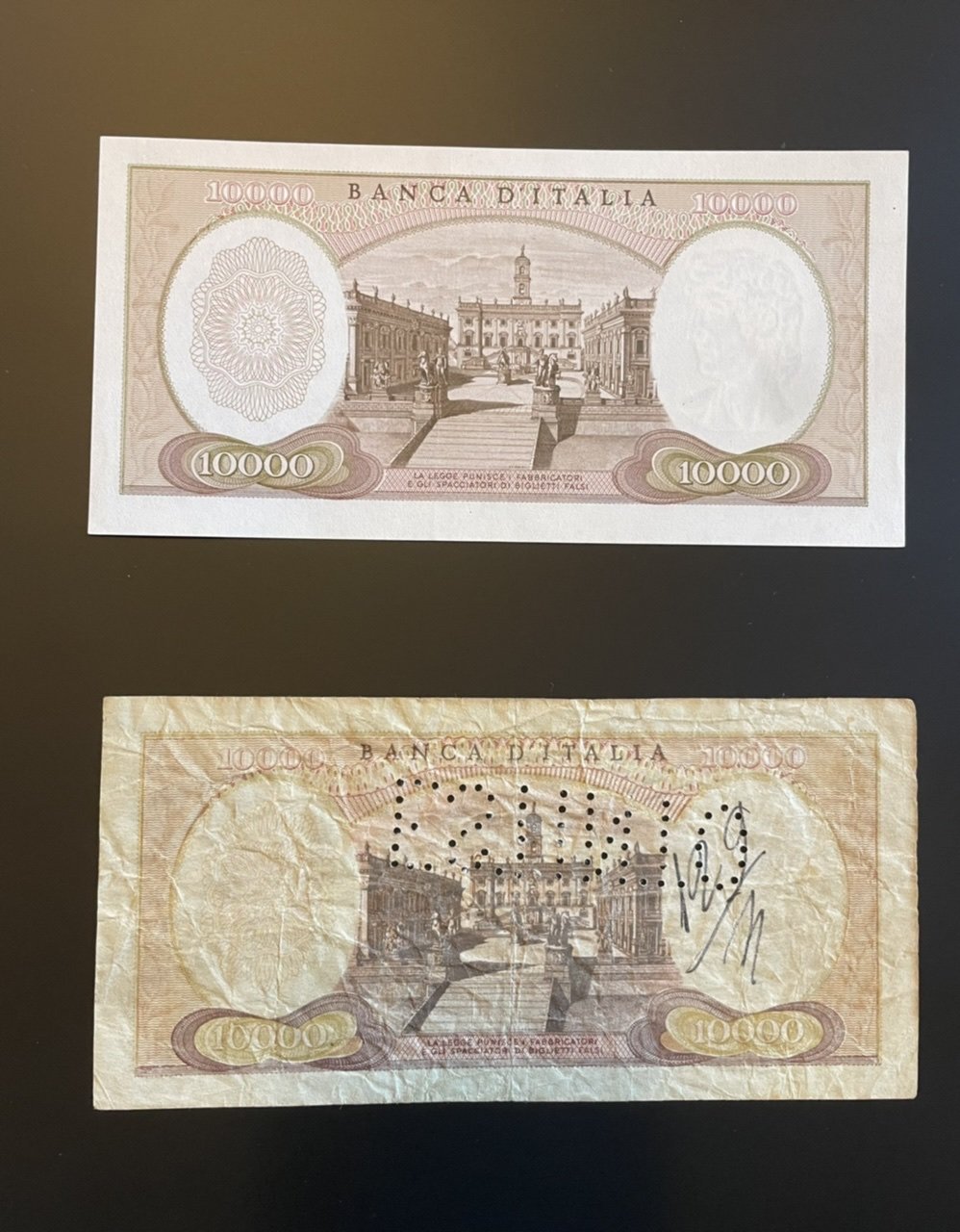 Differenze per riconoscere una banconota originale da un falso d’epoca. Attenzione sopratutto in alcuni dettagli come il busto di Michelangelo e il contrassegno di stato. Oltre che il retro della banconota che nei falsi risulta quasi sempre totalmente impreciso.