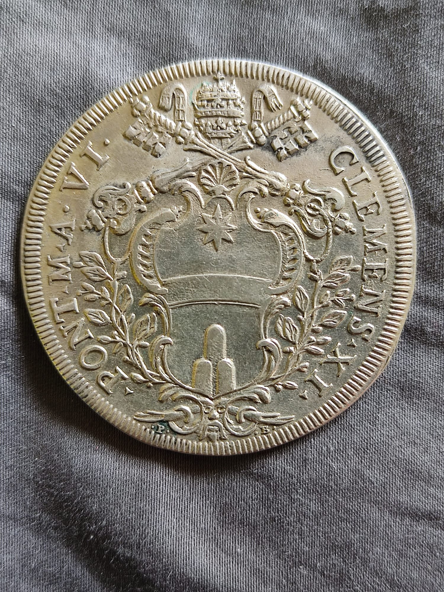 Ciao, moneta più che gradevole! Scevra di segni di montatura o appiccagnolo. Dall'aspetto fotografico, sembra ripatinata dopo una pregressa pulizia. La complessa scena del rovescio rappresenta il Papa pontificante, seduto in trono, che legge l'omelia nella Basilica di Santa Maria Maggiore assistito dai cardinali. Si tratta di una moneta commemorativa per la celebrazione della messa di Natale del 1705. Conio ad opera di Pietro Paolo Borner.